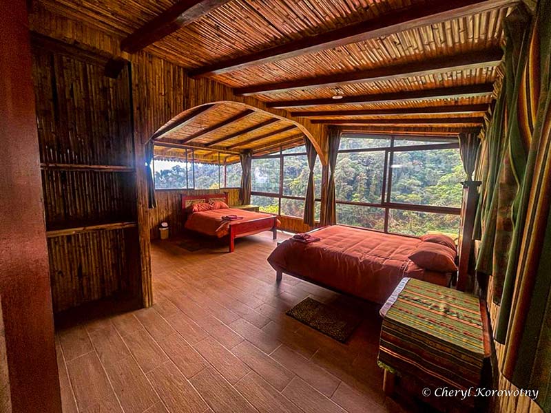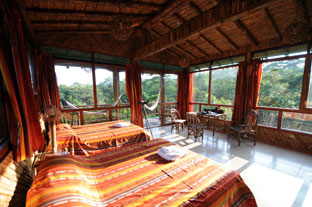 San Jorge Forest Lodge offers spacious rustic Bungalow Rooms inside the Rainforest with – 2 queen beds, private bath, large windows, hammocks.  Optional upgraded rooms are available with Balcony. Our spacious open-air restaurant and observation decks offers natural Hummingbird & Tanager & Toucan feeders, a forest surrounded by birds and a 45-foot high covered tower & observation deck - all canopy.