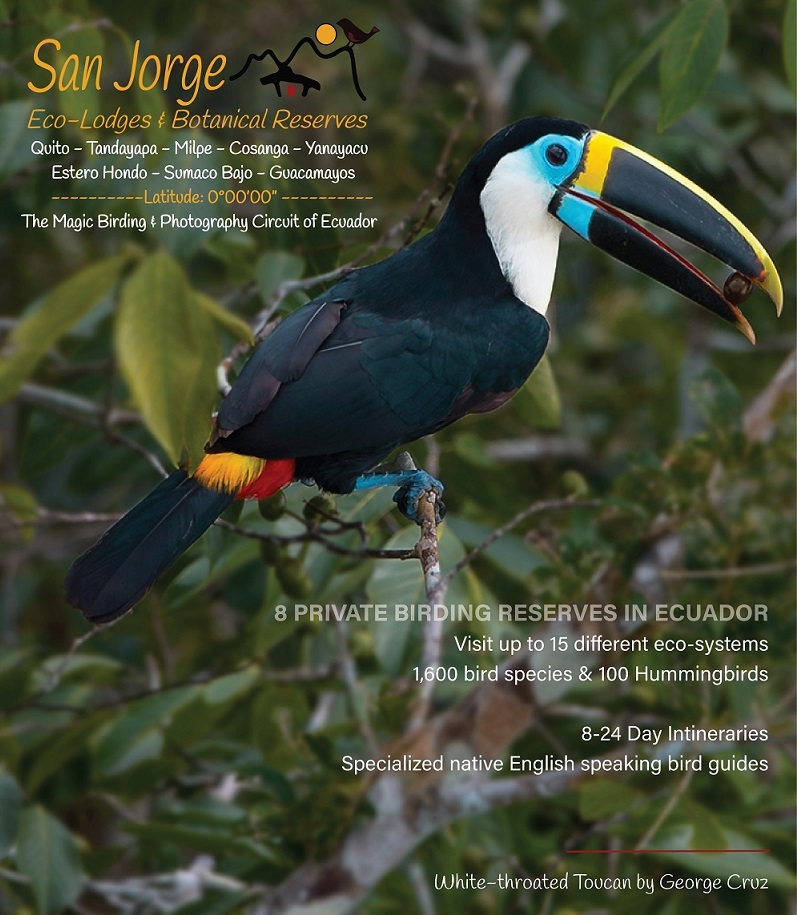 The Magic Birding & Photography Circuit is the first of its kind in South America. We own and operate 7 private Birding Reserves and 6 Eco-Lodges in Ecuador.  Ecuador Birdwatching Tours & Ecuador Bird & Wildlife Photography Tours and Ecuador Nature Tours, visiting up to 9 diverse eco-systems throughout the Andes Highlands, Cloud Forest, Upper Tropical Rainforest, East & West Andes Slope, Paramo, Amazon Tropical Rainforest & Pacific Lowlands.  We have recently have added two new private nature reserves to The Magic Circuit collection, introducing San Jorge de Sumaco Bajo Bird Sanctuary in the Amazon Tropical Rainforest, and the new San Jorge de Guacamayos Bird Paradise in the Eastern Andes Cloud Forest.