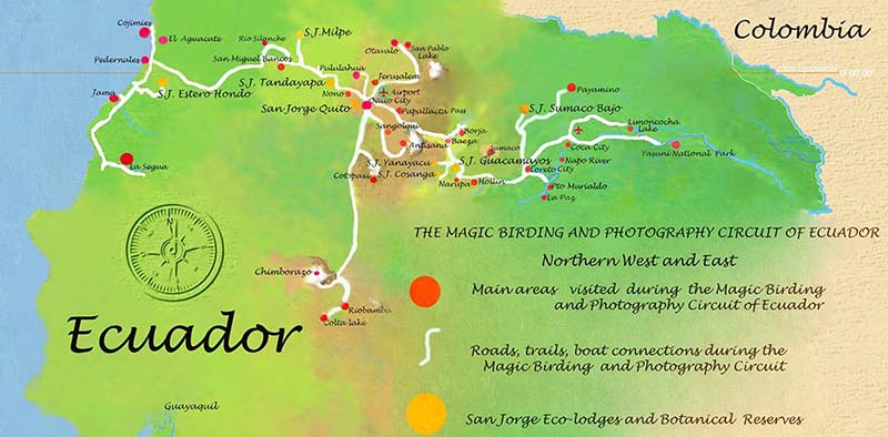 The Magic Birding & Photography Circuit is the first of its kind in South America. We own and operate 7 private Birding Reserves and 6 Eco-Lodges in Ecuador.  Ecuador Birdwatching Tours & Ecuador Bird & Wildlife Photography Tours and Ecuador Nature Tours, visiting up to 9 diverse eco-systems throughout the Andes Highlands, Cloud Forest, Upper Tropical Rainforest, East & West Andes Slope, Paramo, Amazon Tropical Rainforest & Pacific Lowlands.  We have recently have added two new private nature reserves to The Magic Circuit collection, introducing San Jorge de Sumaco Bajo Bird Sanctuary in the Amazon Tropical Rainforest, and the new San Jorge de Guacamayos Bird Paradise in the Eastern Andes Cloud Forest.